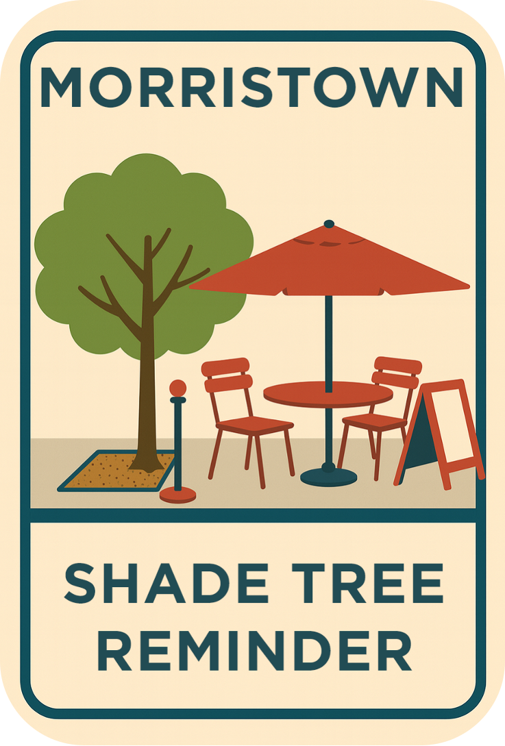 All sidewalk café elements and displays such as umbrellas, seating, stanchions, and signage must be placed and maintained to avoid contact with public trees and nearby tree wells. These areas, including those with FlexiPave, are sensitive and can be easily damaged. Providing adequate clearance helps ensure the long-term health of Morristown’s street trees and streetscape infrastructure.