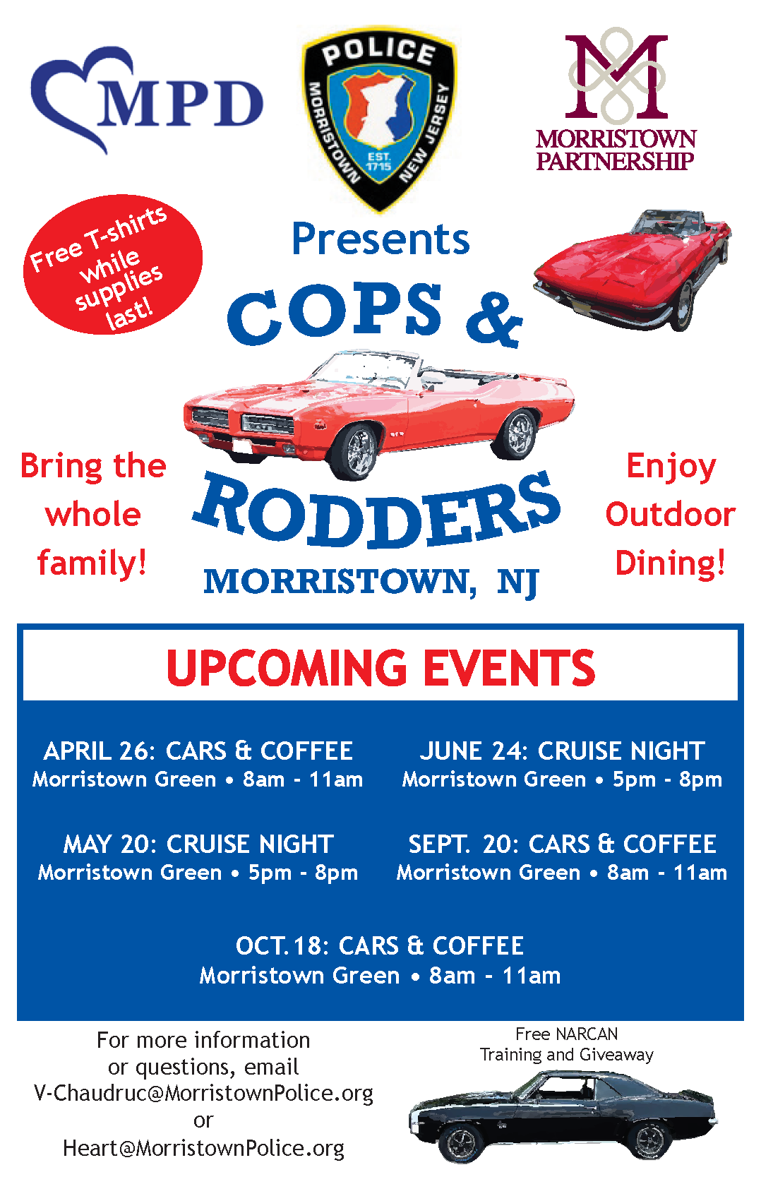 A family friendly community car event hosted by the Morristown Bureau of Police and the Morristown Partnership around the Morristown Green. Enjoy classic and specialty vehicles, meet local officers, and support downtown businesses before or after the events