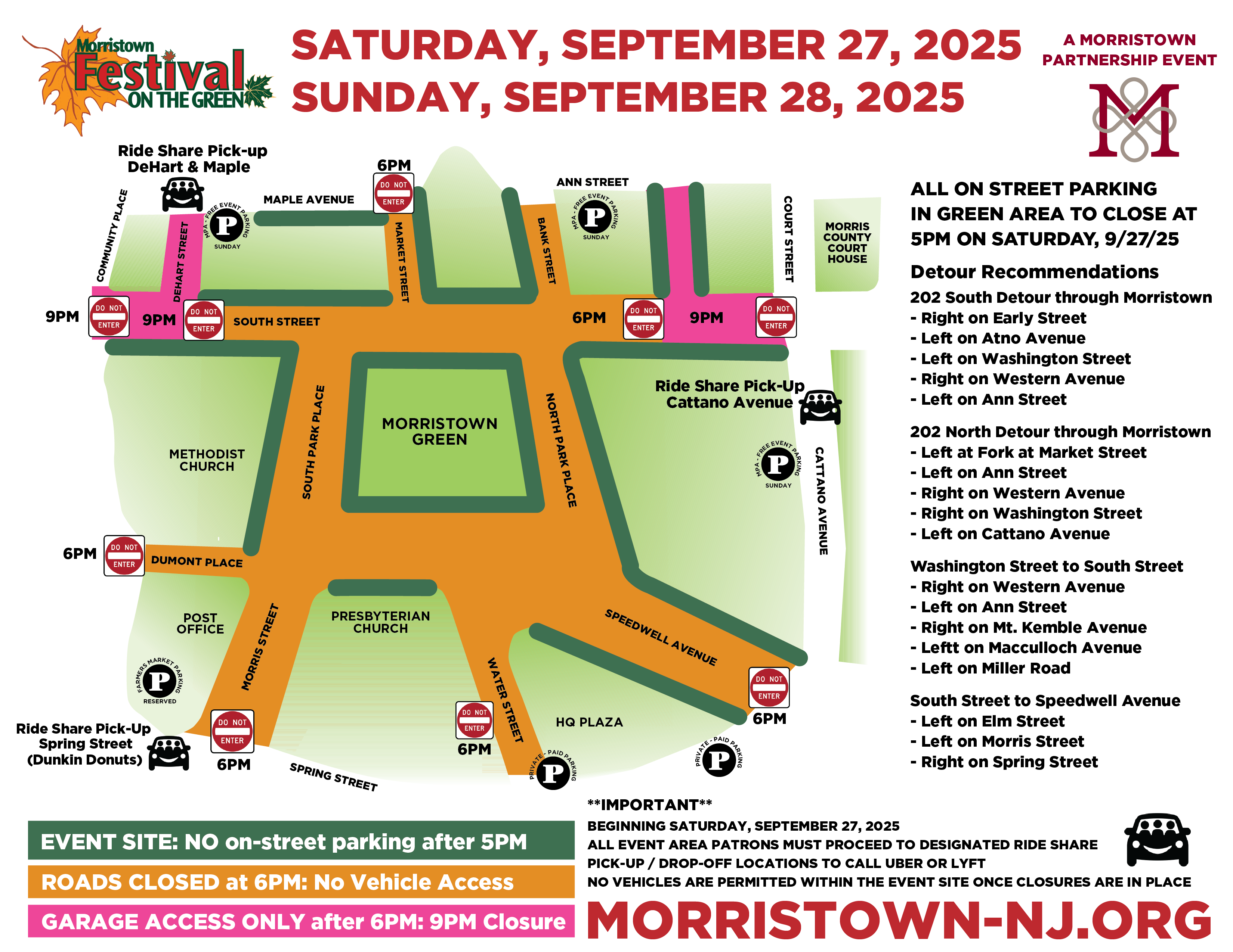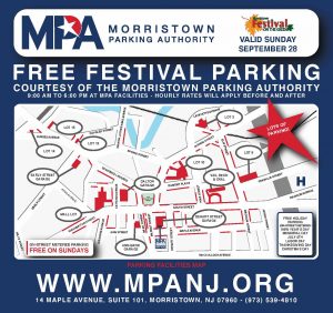 For driving directions, please select your desired parking facility and review the road closures map. Please note that detours around the event site will be in place. Morristown Parking Authority facilities will offer free parking from 9 AM to 6 PM, after which standard rates will apply.