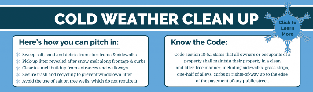 As snow and ice melt, salt, sand, and debris can build up along sidewalks and storefronts. Business owners are reminded to sweep and clear debris from storefront areas, sidewalks, and curbs to help keep downtown safe, clean, and accessible during cold weather.