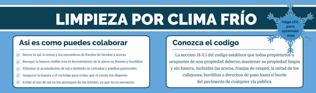 A medida que la nieve y el hielo se derriten, la sal, la arena y los escombros pueden acumularse en las aceras y frente a los negocios. Se recuerda a los propietarios de negocios que limpien y despejen las áreas frente a los establecimientos, las aceras y los bordillos para ayudar a mantener el centro seguro, limpio y accesible durante el clima frío.